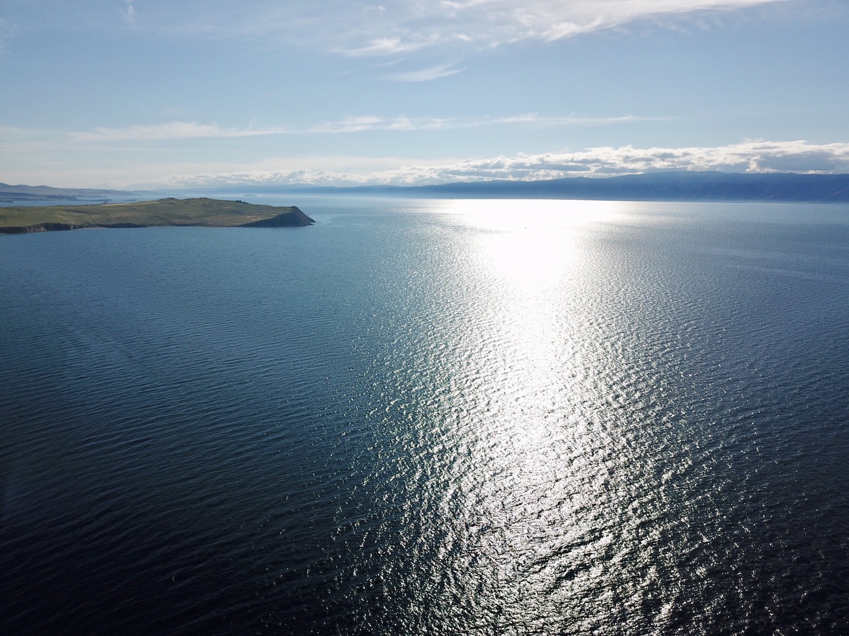 Im Windschatten des Autos sitzend, genießen wir Kaffee und russisches Gebäck. Hier ist wieder so eine Stelle wo man sich wünscht: „Oh Augenblick verweile doch, du bist so schön!“Dieser Ort rückt nun auf Platz 1 unserer Rankingliste der „Schönsten Stellen“ am Baikal. Je mehr sich die Sonne zum Horizont neigt, um so weißer leuchten die Kalkfelsen des höchsten Gipfels der Insel, des 1274 m hohen Berg Schima aus dem dunklen Wald hervor. Dietmar startet die Drohne und unser Auto auf der Klippe erscheint nur noch als winziger Punkt. Unsere Drohne landet mit vielen spektakulären Fotos wieder punktgenau neben uns aus 200 m Höhe. Ein kleines Technikwunder.